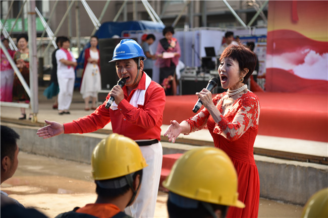 齊魯晚報(bào)張剛大篷車兵媽媽公益藝術(shù)團(tuán)分團(tuán)——桃花盛開(kāi)藝術(shù)團(tuán)現(xiàn)場(chǎng)傾情助演。農(nóng)民工兄弟辛苦勞作,建設(shè)美麗泉城,無(wú)數(shù)個(gè)日夜在異地他鄉(xiāng)艱苦奮戰(zhàn),無(wú)法與家人團(tuán)聚。值端午節(jié)到來(lái)之際,桃花盛開(kāi)藝術(shù)團(tuán)的藝術(shù)家們來(lái)到工地現(xiàn)場(chǎng)慰問(wèn)演出,向農(nóng)民工兄弟表達(dá)敬意,為工地現(xiàn)場(chǎng)百余名農(nóng)民工兄弟們呈現(xiàn)了一場(chǎng)高質(zhì)量、高水準(zhǔn)、精彩紛呈的文藝演出,表演形式豐富多樣,演出內(nèi)容貼近生活、生動(dòng)感人,現(xiàn)場(chǎng)氣氛高漲、反響熱烈。