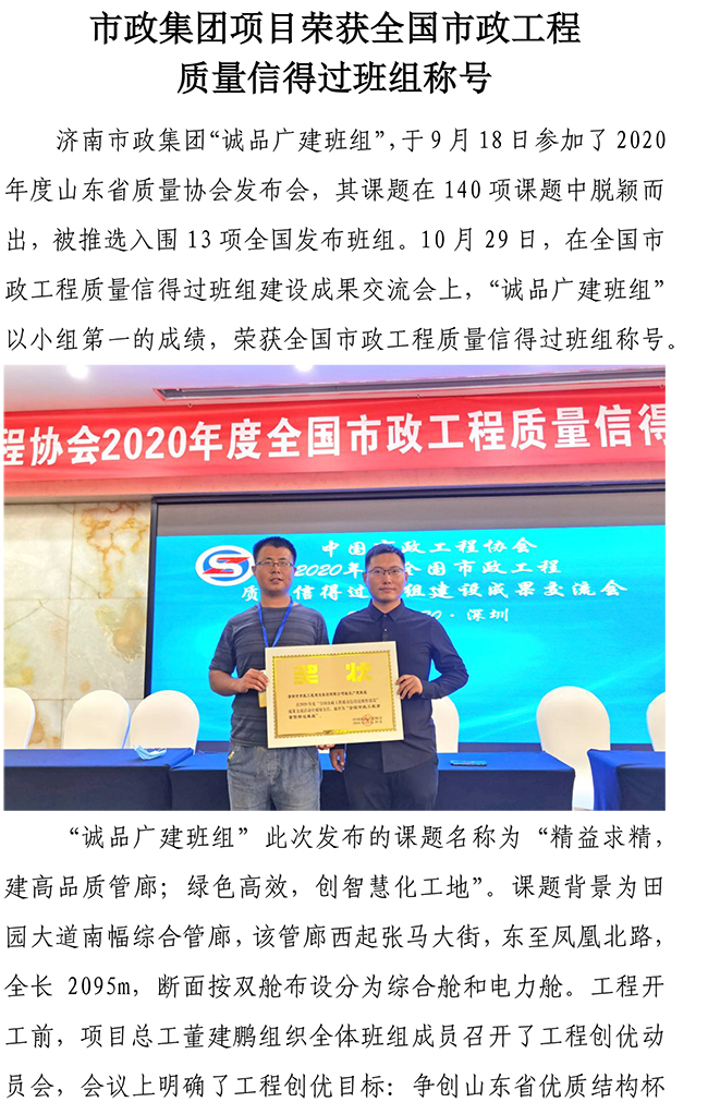 濟(jì)南市政集團(tuán)項(xiàng)目榮獲全國(guó)市政工程質(zhì)量信得過班組稱號(hào)