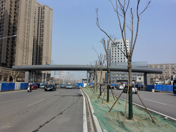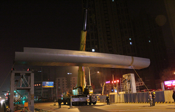 濟(jì)南市市政工程有限公司承建的緯十二路人行天橋工程包含兩座天橋,分別位于經(jīng)二路南側(cè)和經(jīng)五路南側(cè),均橫跨緯十二路。天橋兩側(cè)緊臨普通公交站臺,中間與BRT站臺相接,橋梁上部結(jié)構(gòu)采用鋼箱梁,橋梁全長60米,寬4米,共3跨,下部結(jié)構(gòu)采用鋼板墩,共設(shè)置5處步梯及3部垂直升降電梯,梯道寬2.5米。3月16日晚至3月17日凌晨,濟(jì)南市市政工程有限公司項目部進(jìn)行經(jīng)五路南側(cè)人行天橋主箱梁吊裝施工。