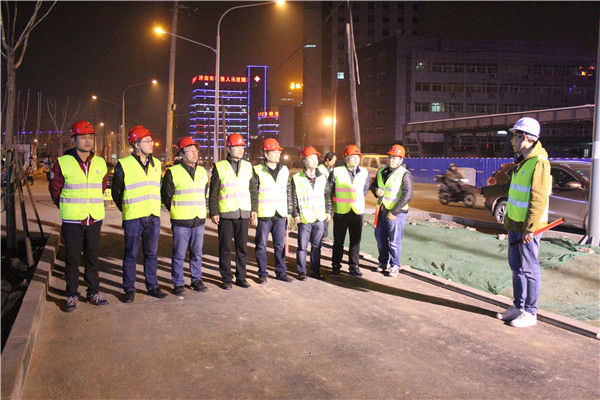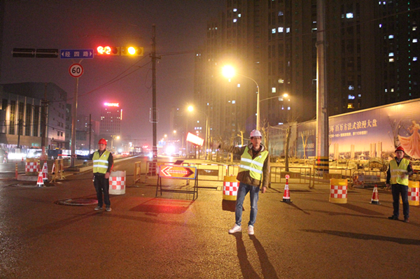 為保證吊裝工作順利進(jìn)行,濟(jì)南市市政工程有限公司項目部提前策劃,與交警等相關(guān)部門充分溝通確定交通組織方案,建立吊裝安全保障小組并明確人員分工;同時為保證后續(xù)施工道路交通安全,濟(jì)南市市政工程有限公司項目部在南北兩側(cè)設(shè)立了臨時限高桿。3月16日晚11時現(xiàn)場正式封閉西半幅快車道吊裝西段主梁,在東半幅快車道中間進(jìn)行隔離,南行及北行車輛分車道行駛,盧浮公館小區(qū)東門與緯十二路交叉口在西側(cè)箱梁吊裝期間進(jìn)行封閉,車輛及行人繞行小區(qū)西門或南門。西段主梁吊裝完成后封閉東半幅快車道,吊裝東段主梁。濟(jì)南市市政工程有限公司于3月17日凌晨4時完成經(jīng)五路人行天橋主箱梁吊裝施工。